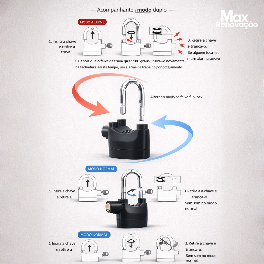 Ele funciona muito bem em portões residenciais, comércios, motos, bicicletas, correntes, grades, armários e portas metálicas. E o melhor: você escolhe se quer usar o alarme ativado ou apenas o travamento físico, o que deixa o produto muito mais versátil.