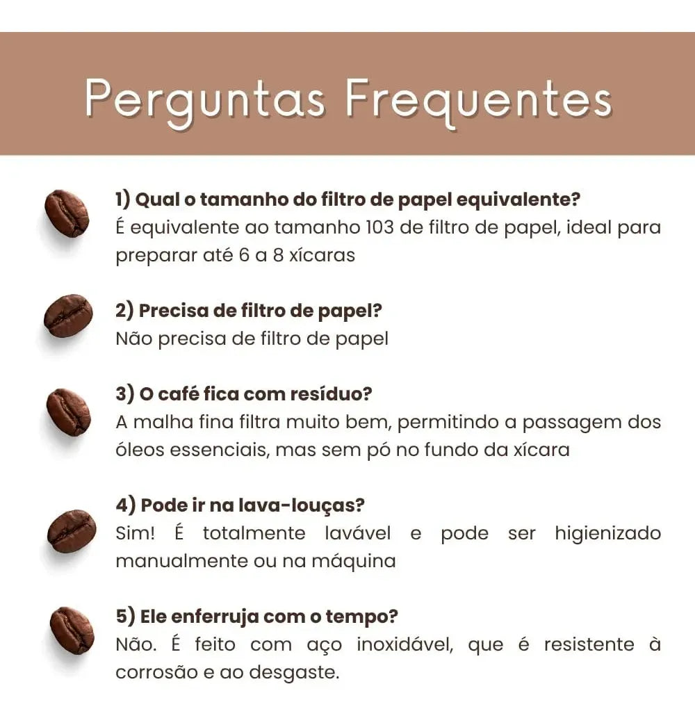 Agora, se livra dessa imagem. Pensa em acordar, pegar seu pó de café, colocar direto no **Coador de Café Permanente**, passar sua água e pronto. Fim. Um café com sabor PURO, sem interferência. E quando terminar? Uma lavadinha rápida na pia e ele está novo, pronto pra amanhã, depois de amanhã, pro ano que vem... É a liberdade de nunca mais depender de filtro de papel. É sentir o gosto de verdade do seu café e ainda ter a consciência tranquila de que você fez uma escolha inteligente e ecológica.