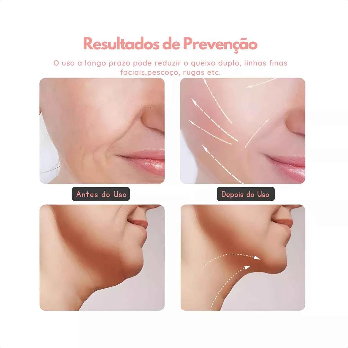 O efeito lifting imediato pode ser notado logo após o primeiro uso. Para resultados permanentes em rugas e papada, recomenda-se o uso diário de 5 a 10 minutos.