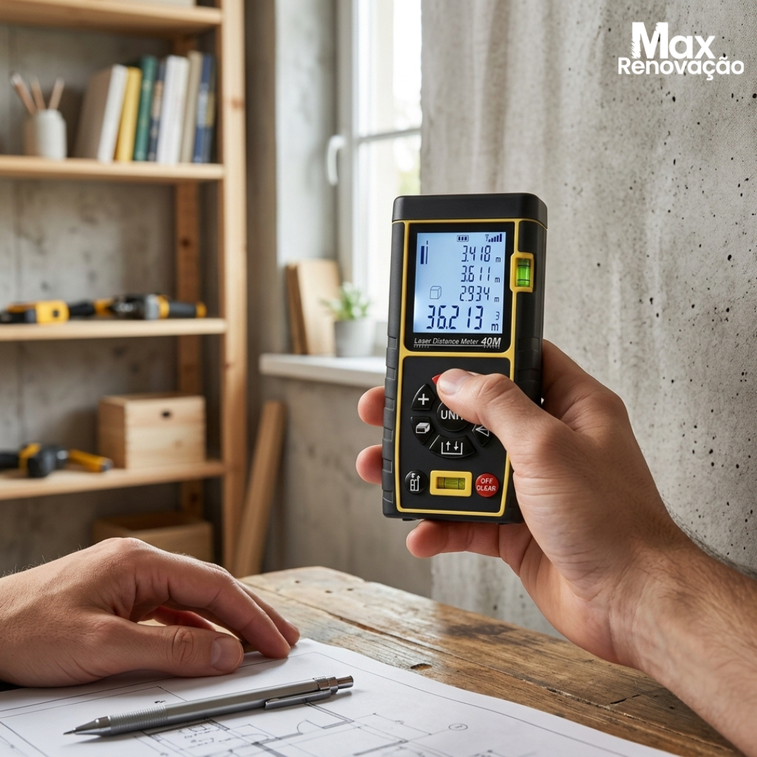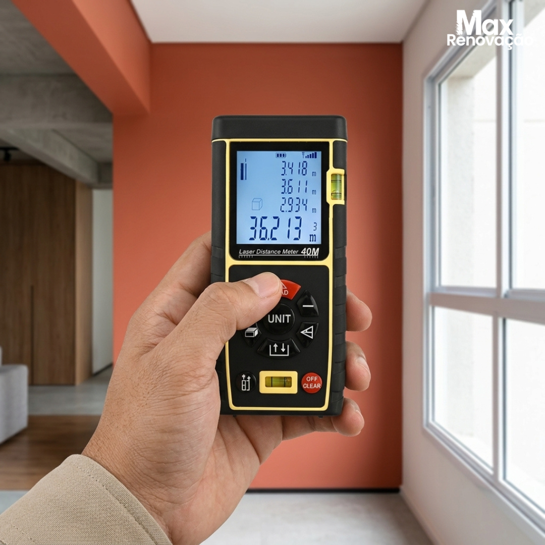 Eu trouxe esse medidor de distância a laser porque fita métrica comum ainda trava muita gente na hora de medir parede, ambiente, móvel planejado ou reforma. Quando a distância aumenta, o erro aparece. E é aí que o prejuízo começa.
